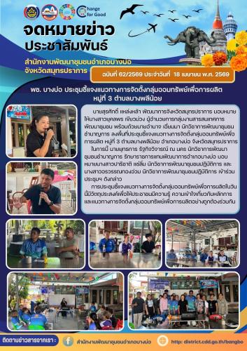 นายสุรศักดิ์ แหล่งหล้า พัฒนาการจังหวัดสมุทรปราการ มอบหมายให้นางสาวยุคลพร เขียวม่วง ผู้อำนวยการกลุ่มงานสารสนเทศการพัฒนาชุมชน พร้อมด้วยนายอำนาจ เอี่ยมมา นักวิชาการพัฒนาชุมชนชำนาญการ ลงพื้นที่ประชุมชี้แจงแนวทางการจัดตั้งกลุ่มออมทรัพย์เพื่อการผลิต หมู่ที่ 3 ตำบลบางพลีน้อย อำเภอบางบ่อ จังหวัดสมุทรปราการ